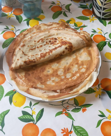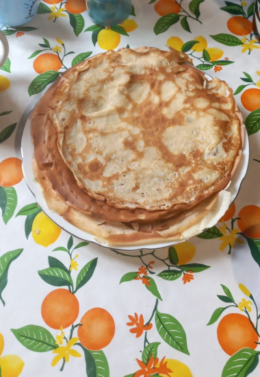 Продуктов взяла больше, на 1 л молока. Получились не тонкие, но это я так выпекала. Вкусные! Получилось много, половину слопали сразу!