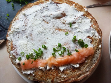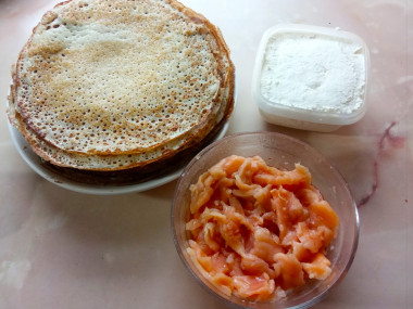 Намажьте сыр на блин тонким слоем. Положите ближе к краю полоски рыбы.