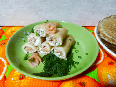 Сегодня готовлю блины с красной рыбой и творожным сыром. Накануне засолила красную рыбу из купленной обрези, творожный сыр также взяла домашний ( на сайте есть рецепты его приготовления). Заварные блины получились очень вкусные! Намазала их тонким слоем творожного сыра, выложила кусочки рыбы, добавила мелко нарезанный зелёный лук, свернула рулетиками. При подаче блинные рулеты разрезала на три части, для удобства. Получается прекрасная закуска как для повседневного, так и для праздничного стола. Спасибо за рецепт, katushafin!