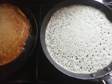 Жарьте блин до румяности на одной стороне, затем переверните на другую. Огонь отрегулируйте так, чтобы блин жарился быстро, но не горел. Готовый блин снимите со сковороды. Пожарьте таким образом блины из всего теста.